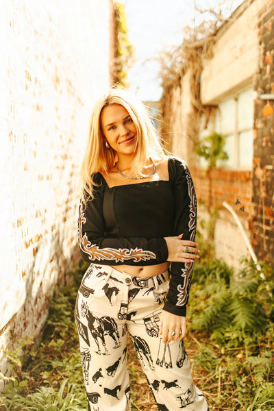 cThis stylish Cut it Western Crop features cut out sleeves and western detailing, perfect for a trendy and unique look. With long sleeves and a black color, this crop top will add a touch of edge to any outfit.