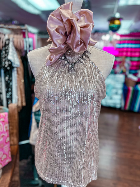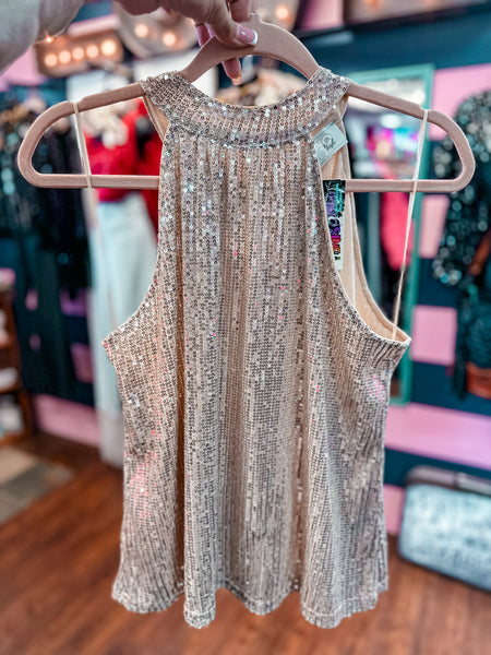 Elevate your festive wardrobe with this champagne sequin holiday top, designed to capture the sparkle of celebration. Perfect for New Year's Eve gatherings and holiday parties, the shimmering sequin detailing creates an eye-catching statement that transitions seamlessly from dinner to dancing. The expert craftsmanship ensures the sequins remain secure through the night, while the flattering silhouette works for various body types. Ideal for anyone seeking that perfect balance of glamour and wearability during the season's most memorable occasions.