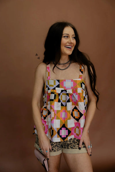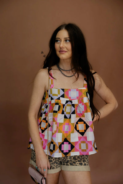 Embrace vintage charm with this quilted spring top, featuring a classic granny square pattern that brings nostalgic warmth to your seasonal wardrobe. The soft, quilted fabric drapes beautifully in a relaxed baby doll silhouette, perfect for layering or wearing solo. Flowy and effortless, this piece captures the essence of spring style with its timeless patchwork design. Ideal for casual days and breezy evenings, it's a versatile staple that pairs beautifully with denim or flowing skirts.