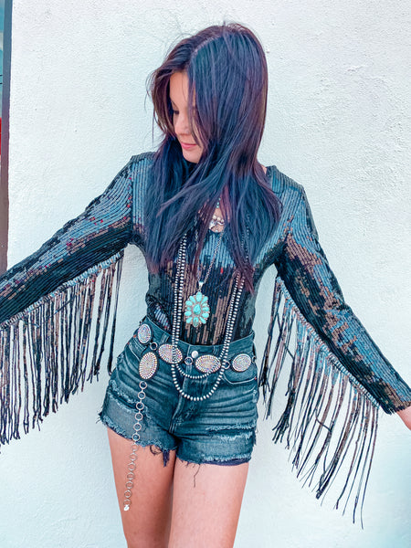 Dazzle in this eye-catching sequin fringe sleeve bodysuit, designed for those who love to make a statement. Shimmering sequins catch the light with every move, while playful fringe sleeves add movement and flair. Perfect for nights out, performances, or whenever you want to feel confident and fabulous. This stylish piece combines glamour with comfort, making it an instant favorite for your wardrobe.