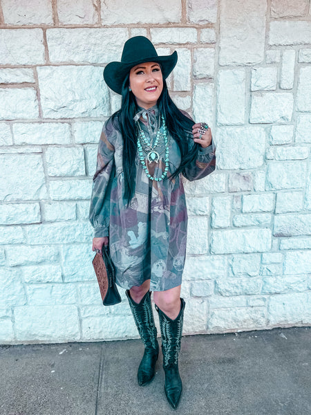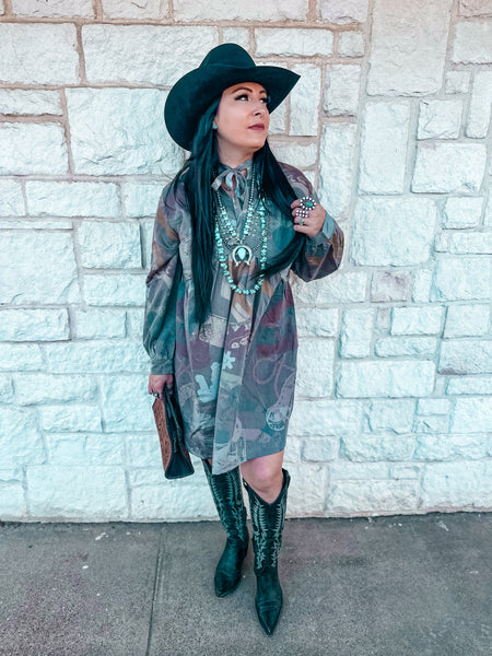 Saddle up in this playful baby doll dress featuring a striking western spur rowel print that captures authentic cowgirl spirit. The relaxed silhouette flatters all figures while the charming tie detail at the neckline adds a touch of vintage-inspired elegance. Perfect for spring gatherings, casual outings, or anyone who loves western-inspired fashion with a modern twist. This dress effortlessly transitions from day to night, making it a versatile staple for the season ahead.