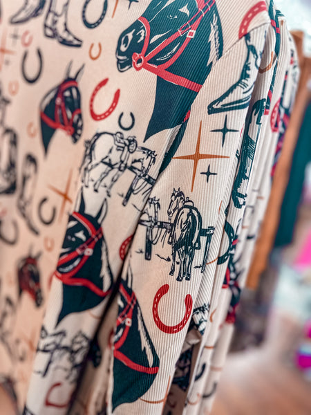 Head Over Heels Top This luxurious long-sleeve layering piece brings western sophistication to your everyday rotation. Designed with a refined western print and premium construction, it serves as the perfect foundation for building elevated cowgirl looks. The versatile cut layers beautifully under jackets and vests while standing confidently on its own. Expert tailoring ensures a flattering fit that transitions seamlessly from casual ranch days to polished evening wear. An essential investment for discerning western enthusiasts who demand both style and substance.
