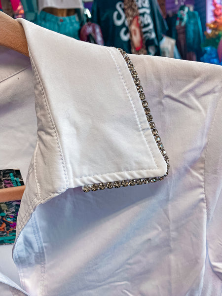 Elevate your wardrobe with this sophisticated button-up featuring an eye-catching rhinestone collar that adds instant glamour to any ensemble. The crisp white fabric pairs beautifully with the flattering silhouette designed to complement your figure, while the front tie detail offers versatile styling options—wear it cinched for definition or loose for effortless elegance. Perfect for dressing up casual occasions or adding a polished touch to your everyday look.