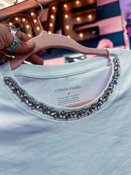 Upgrade your wardrobe with our Ritzy Rhinestone Tee. The baby doll tee offers a fitted style with a touch of glam, thanks to the rhinestone collar detail. Stay stylish and on-trend with this must-have piece.