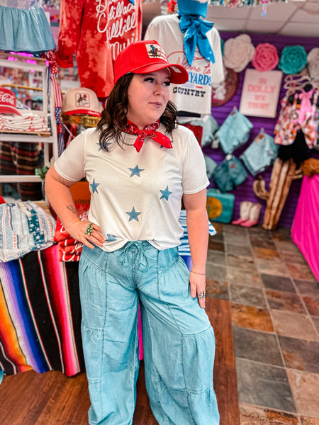 Celebrate your patriotic spirit in style with this Star Spangled Tee. Adorned with eye-catching stars, shimmering rhinestones, and bold patches, this tee combines classic American pride with modern flair. Perfect for Independence Day gatherings, casual outings, or whenever you want to show your love for the red, white, and blue. The rhinestone embellishments catch the light beautifully, while the carefully placed patches add dimension and character. Comfortable, versatile, and undeniably stylish—this is the patriotic piece your wardrobe has been waiting for.
