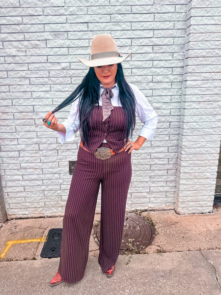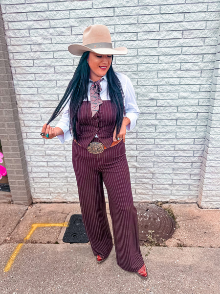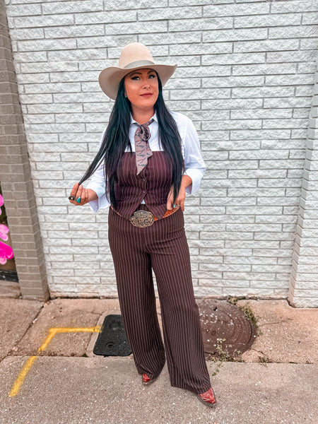 The Western Spin Stripe Jumpsuit combines a classic pinstripe pattern with a contemporary strapless design, crafted in a versatile brown fabric. This garment offers both a sophisticated aesthetic and comfort, making it suitable for various occasions. Its structured silhouette enhances body shape while promoting ease of movement.